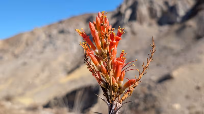 There is evidence of recent rainfall, such as blooming Fouquieria splendens splendens | ocotillo and Horsfordia newberryi | Newberry's velvet mallow with fresh fruit.